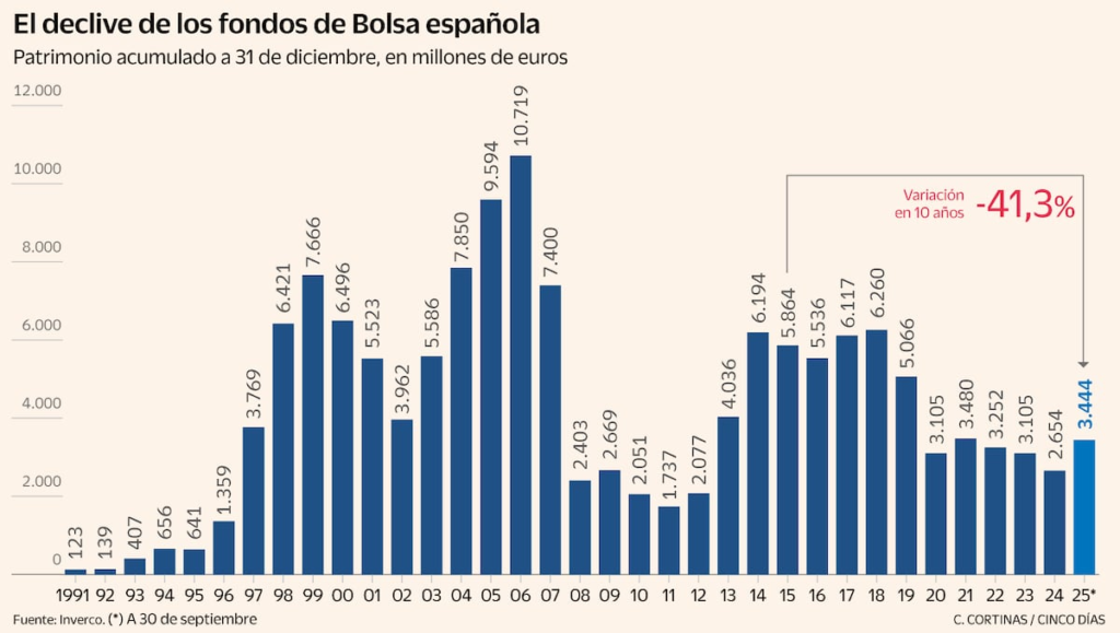 El patrimonio acumulado en este tipo de fondos está en 3.444 millones de euros al cierre de septiembre, según datos divulgados ayer por Inverco, la asociación del ramo. La cifra es un 29% superior a la registrada al cierre de 2024, pero este incremento se explica exclusivamente por la propia revalorización de las acciones españolas en las que invierten estos vehículos. De hecho, el nivel actual es similar al que había a finales de 2021. Así que la evolución bursátil está valiendo, a duras penas, para compensar las salidas de dinero. En su mejor momento para esta categoría de fondos, en 2006, llegó a haber más de 10.000 millones de euros.